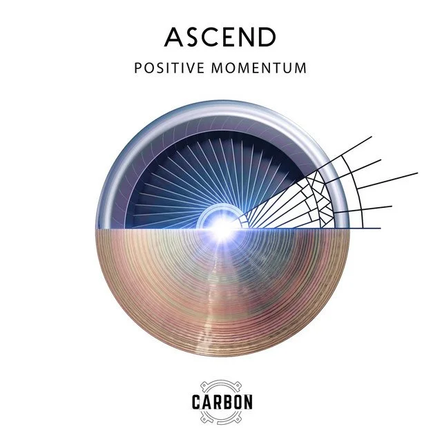 An illustrative graphic of a quarter circle with a radiant light at the center, labeled 'Ascend' with the subtitle 'Positive Momentum.' The bottom features the word 'Carbon' inside a stylized gear. Lines radiate outward from the light, suggesting upw