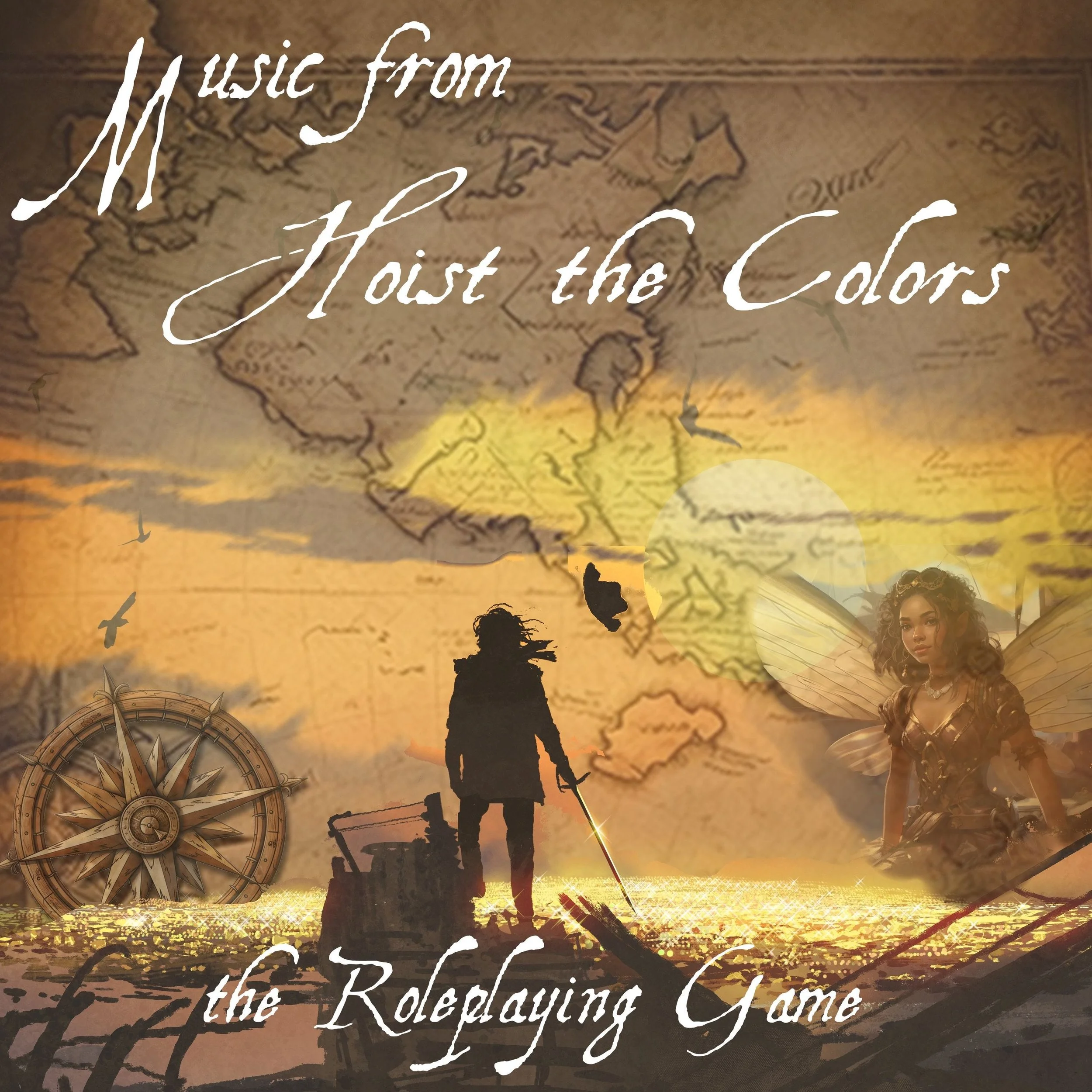 A fantasy scene with a map background, a silhouette of a person with a sword and luggage, a fairy-like woman with wings, a compass, and flying birds, with text overlay reading 'Music from Hoist the Colors the Roleplaying Game'.